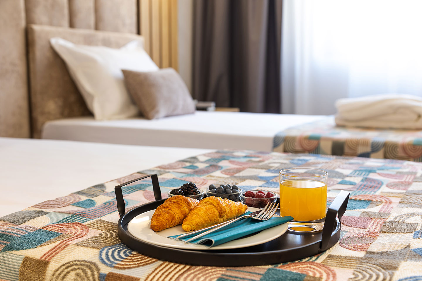 Двойните стаи, за единично или двойно настаняване, са комфортно обзаведени в духа на хотела. Очарователни и модерни, те ви представят хармония от цветове. Стаите са с легло 160 х 190 см или две легла 90 х 190 см и са подходящи за до двама души, без възможност за допълнително настаняване. Те са достатъчно светли и големи, за да се чувствате уютно в тях.