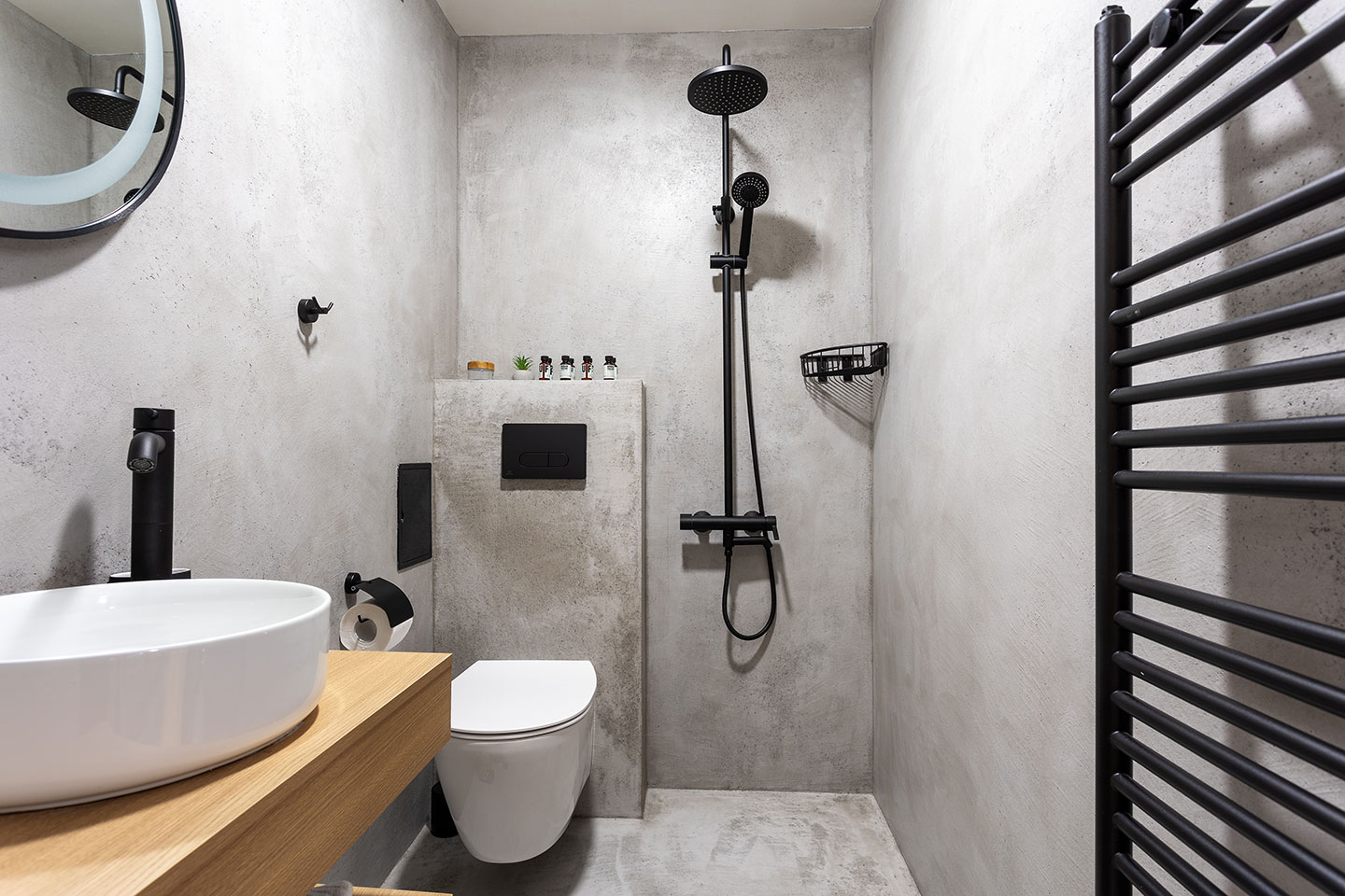 Банята е изпълнена с най-съвременните и модерни мазилки създаващи усещане за уют и комфорт.