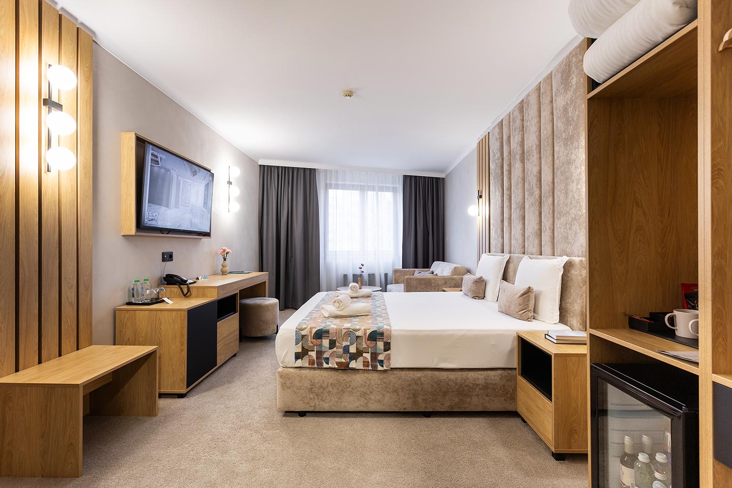 Стаите разполагат с всичко необходимо за пълноценна почивка – удобно легло с матрак от серия Cashmir, комфортен кът за сядане с фотьойл и ниска масичка, 50“ плоскоекранен смарт телевизор с кабелна телевизия, безшумен минибар, електрическа кана, нес кафе, чай и минерална вода – комплимент от хотела. А за ефективна работа – работно бюро, подходящо осветление и безплатен достъп до отличен интернет.