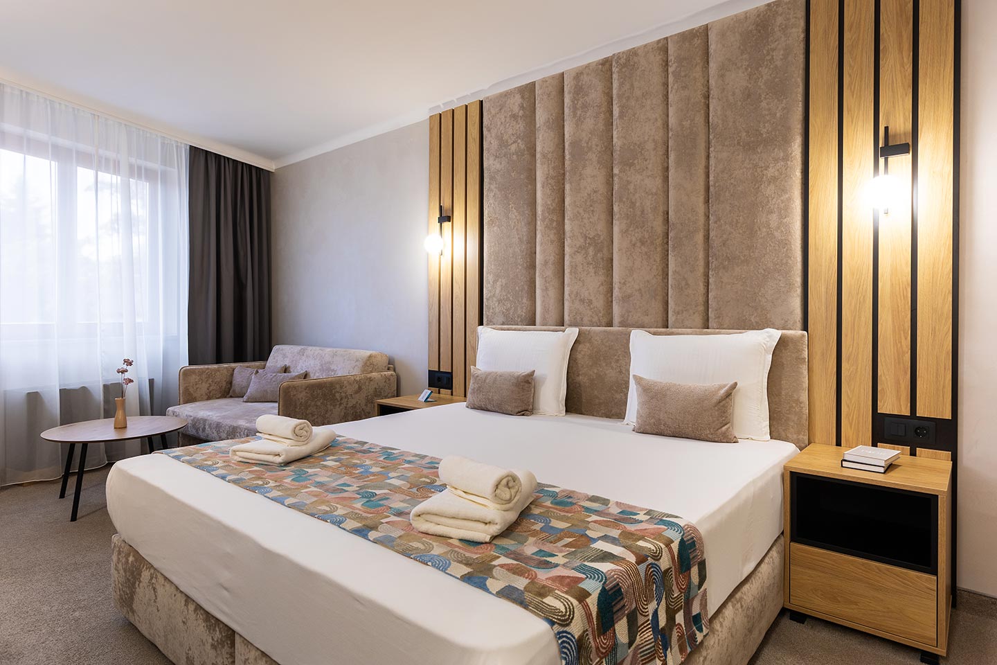 Делукс двойните стаи, са подходяюи за настаняване на 2 възрастни и 1 дете. Те са комфортно обзаведени в духа на хотела. Стаите са с легло 180 х 190 см, както и голям разтегателен фотьойл, снабден с италиански механизъм и пълнеж, за максимален комфорт при спане. Те са достатъчно светли и големи, за да се чувствате уютно в тях.