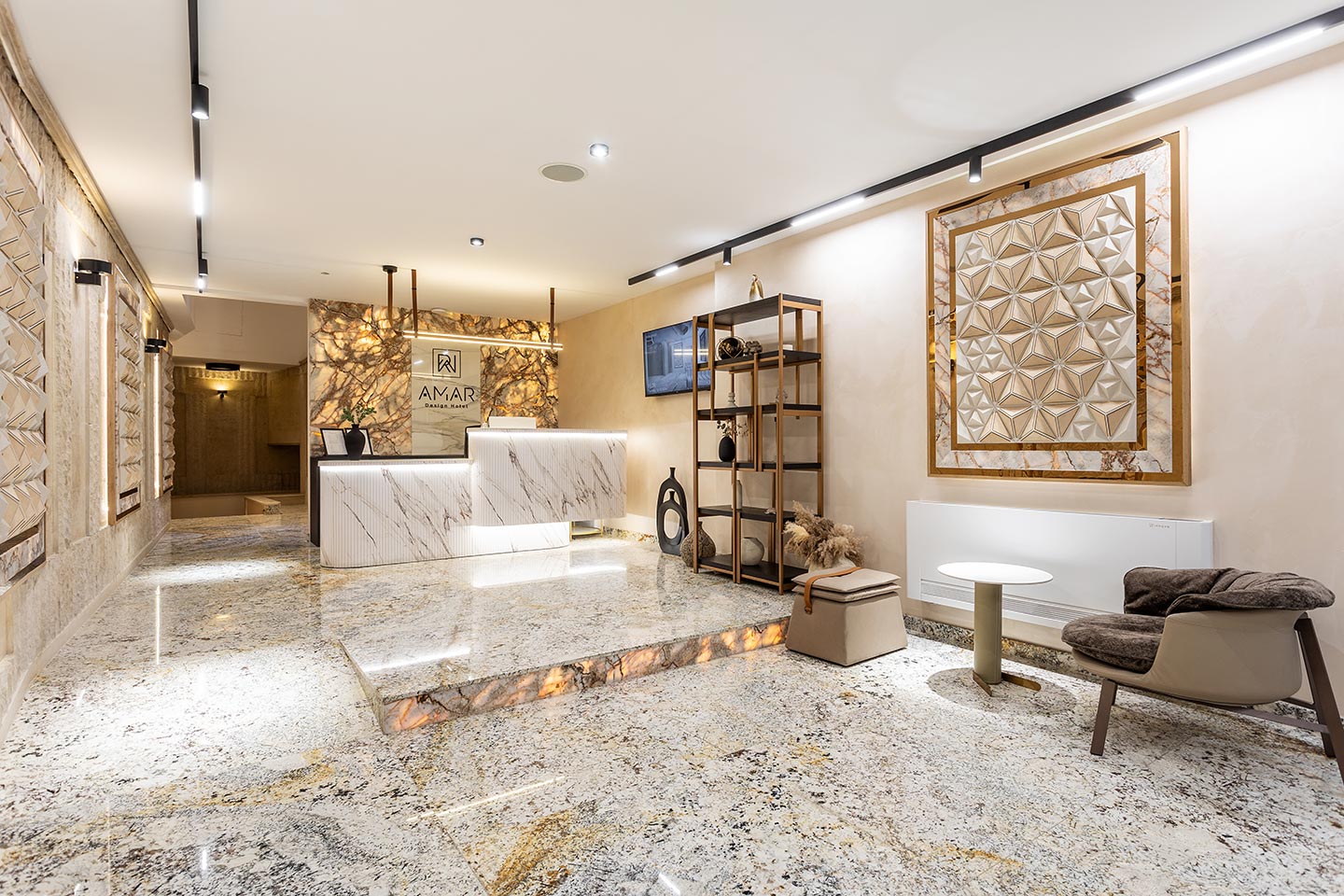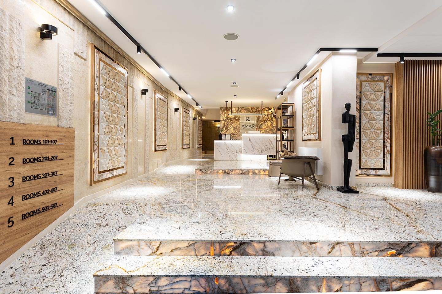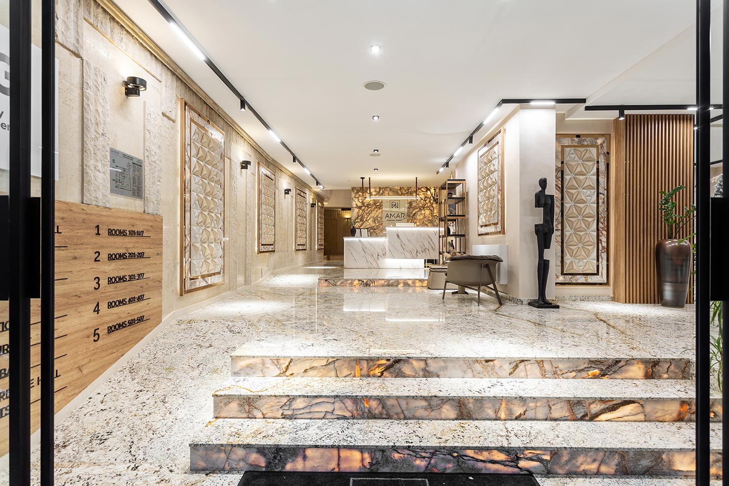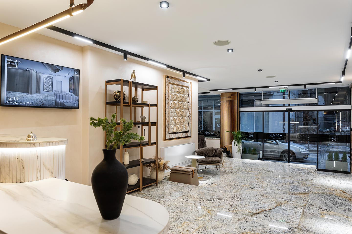 В цялостната му реконструкция са вложени най-висок клас естествени материали, качествени мазилки и подови покрития, както и най-нашумелите и изключително комфортни и ефективни решения за мокри пространства от Коурсанит. Гостите на хотела могат лесно да проверят времето, полетите на летище София, да свържат телефона си и да гледат каквото пожелаят използвайки wi-fi мрежата в стаята си и централното захранване, за да не използват батерията на телефона си. Минибаровете в Амар са на немската марка Klarstein и разполагат с над 20 артикула, за да бъдат на разположение на клиентите по всяко време. Бравите и индикаторите в коридорите позволяват клиента сам да определи дали и кога да бъде почистена стаята само с един клик. Индикират състоянието на стаята и желанията на госта в реално време. Амар е хотел за хора които ценят комфорта и личното си удобство, на разположение са матраци от серия „hotel CACHMERE“ и 4 вида възглавници, отговарящи на всички изисквания в посока височина, твърдост, пълнеж.